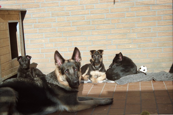 Babsi vom Greifenhorst mit drei Welpen aus ihrem zweiten Wurf
